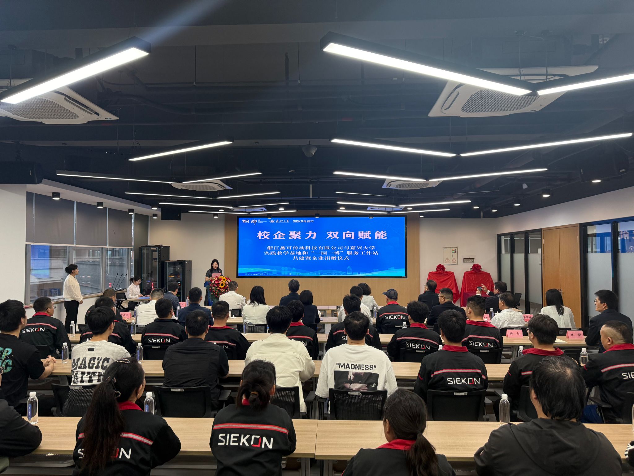 5月8日下午,beat365官方网站与浙江鑫可传动科技有限公司在桐乡数字经济双创中心举行实践教学基地和“一园一博”服务工作站共建暨企业捐赠仪式。beat365官方网站党委委员、副校长(主持日常工作)张琦,桐乡市委书记王坚,浙江鑫可传动科技有限公司董事长於文勇出席仪式并致辞。