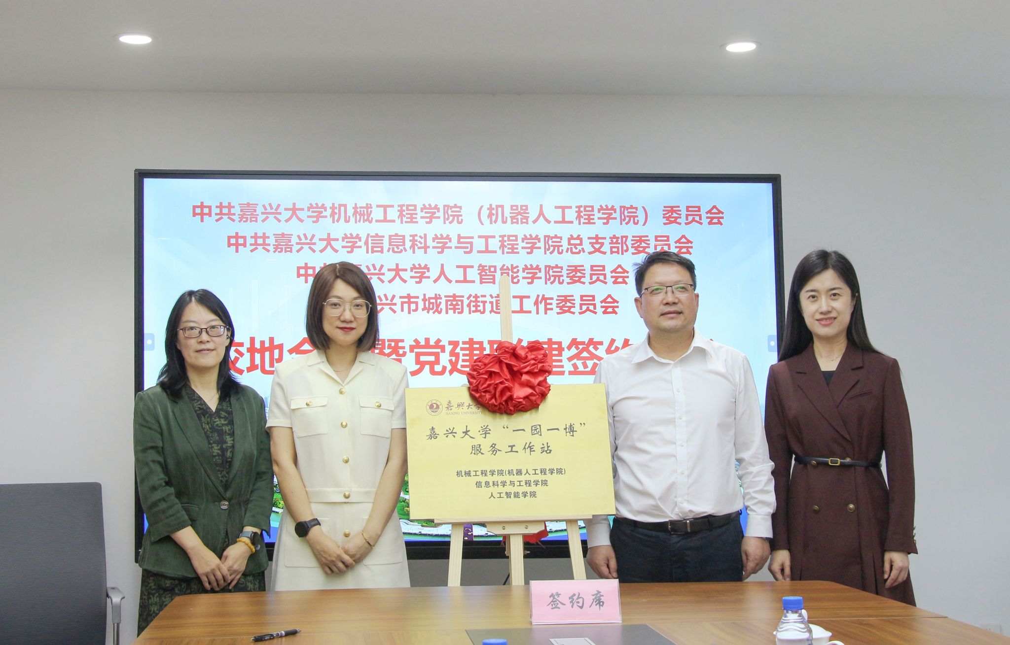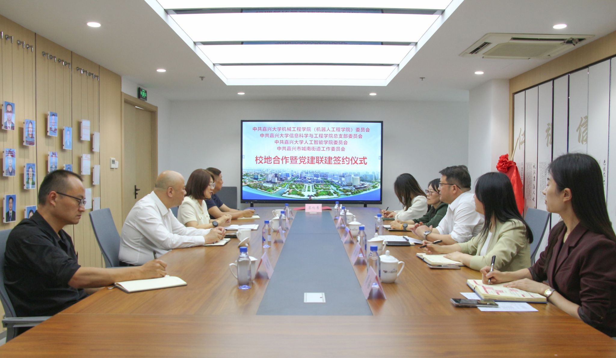 5月13日下午,beat365beat365官方网站(机器人工程学院)、信息科学与工程学院、人工智能学院与嘉兴市城南街道“一园一博”服务工作站启动暨校地合作签约仪式在城南街道党群服务中心举行。城南街道党工委书记韩峻,党工委副书记、办事处主任何瑛,党工委委员周翟,人大工委副主任蒋献伟,beat365beat365官方网站(机器人工程学院)院长朱耀东、党委书记战昕,信息科学与工程学院党总支书记朱奕远,人工智能学院党委书记周钰等出席活动。