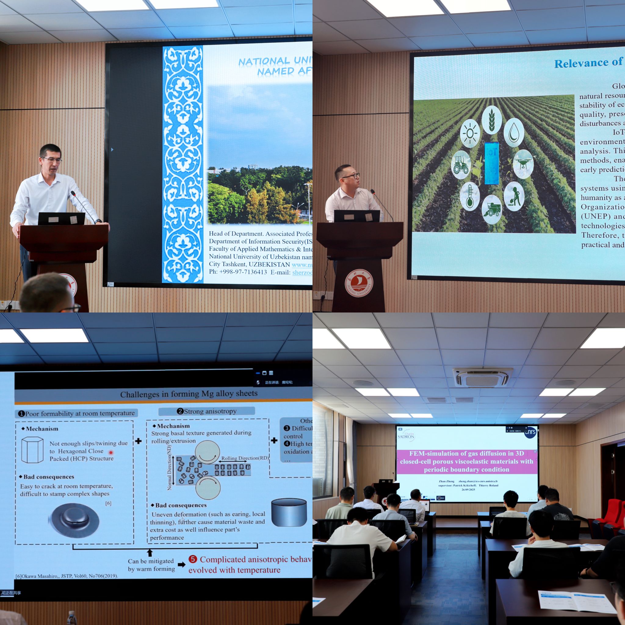 在专题报告环节,多位专家学者分享了最新研究成果。乌兹别克斯坦国立大学信息安全部门负责人 Sherzod Boltaev博士分享了LWC in IoT的相关内容,信息安全部门和研究副主任 Islambek Saymanov博士围绕基于物联网技术的生态系统生物状态测定作了报告;来自东京大学的庞佳丽博士介绍了镁合金板材在不同温度下各向异性行为的建模方法;就读于法国斯特拉斯堡大学的博士生詹政就具有周期边界条件的三维闭孔粘弹性材料中气体扩散的有限元模拟展开介绍。