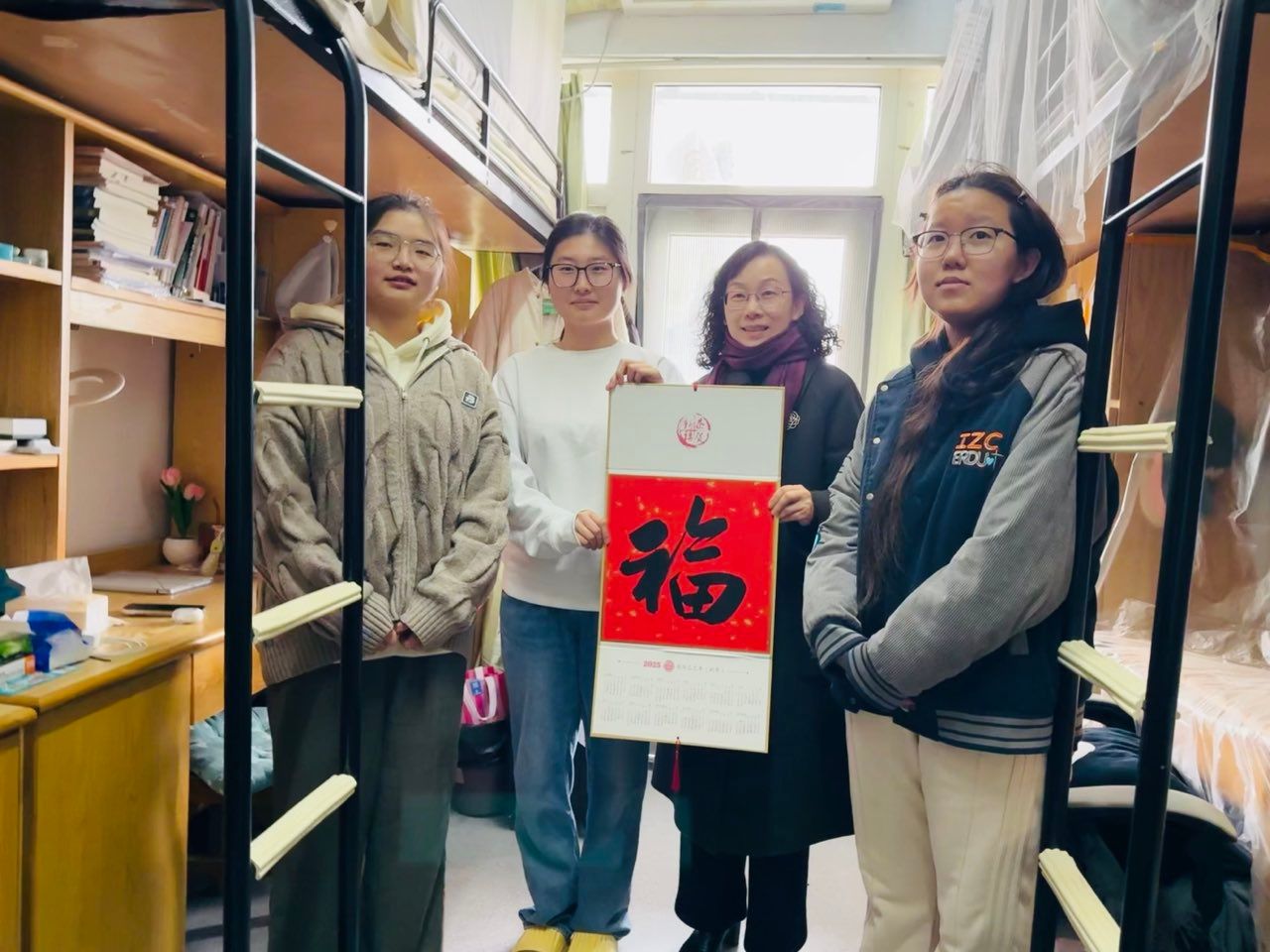 走访中,张琦副校长为同学们送上饱含新春祝福的“福”字,并叮嘱大家:“新学期是锚定目标的新起点,同学们既要脚踏实地完成学业任务,也要主动适应社会变革,成为兼具专业素养与时代敏锐度的复合型人才。”